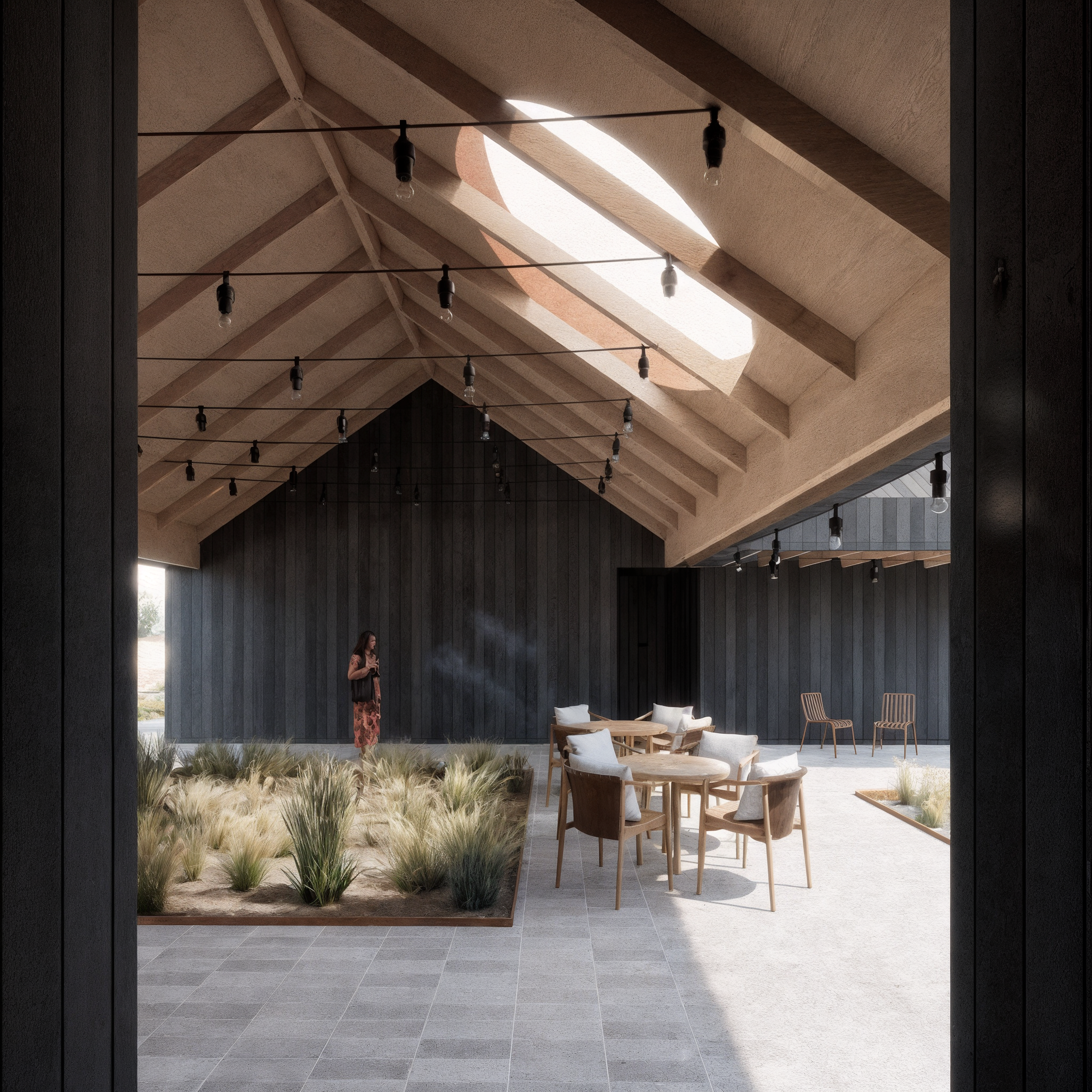 We used simple, pitched-roof building forms common to the area, arranging them to create useful and sheltered outdoor spaces that prioritize views and access to the sea. For the building exteriors, we specified black charred timber cladding—a robust, low-maintenance material that provides a sacrificial defence against the harsh coastal environment. The masterplan strategy focuses on enhancing the natural environment by reinstating historic patchwork field patterns with native hedgerows and drystone walls.